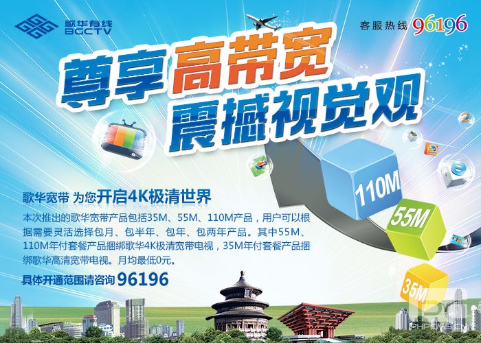 5月1日起,歌华有线在部分区域推出35M、55M、110M高速宽带产品,其中55M、110M年付套餐产品捆绑歌华4K极清宽带电视,无需下载、直接点播4K“极清”院线大片。