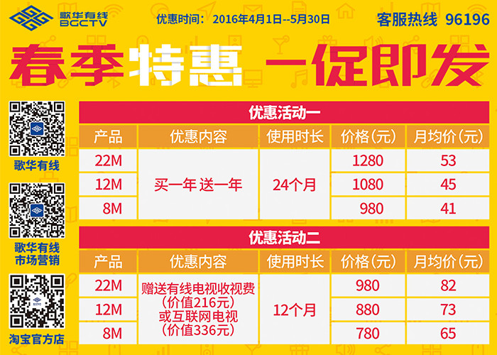 一、活动时间: 2016年4月1日起 二、活动范围: 歌华宽带新装或续费用户 三、活动内容: 凡新装或续费歌华宽带22M、12M、8M的用户可享受优惠活动一或优惠活动二。 优惠活动一:买一年送一年,月均低至41元。 优惠活动二:赠送互联网电视(价值336元)或有线电视收视费(价值216元)的活动,月均低至65元。 详情请咨询当地营业厅或客服热线96196。