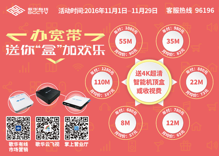 4、温馨提示:①优惠内容亦可选择送收视费。②歌华宽带110M、55M、35M目前已在东城、西城、朝阳、海淀、丰台、石景山、顺义全面覆盖。22M、12M、8M已在我市发放高清交互机顶盒的区域全面覆盖。