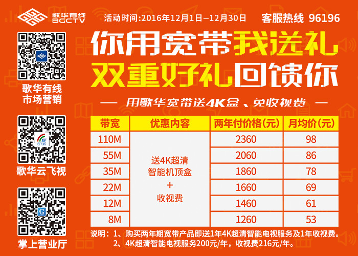 2、新装或续费110M-8M包两年宽带产品的用户送1年4K超清智能电视服务以及1年收视费,月均低至53元。