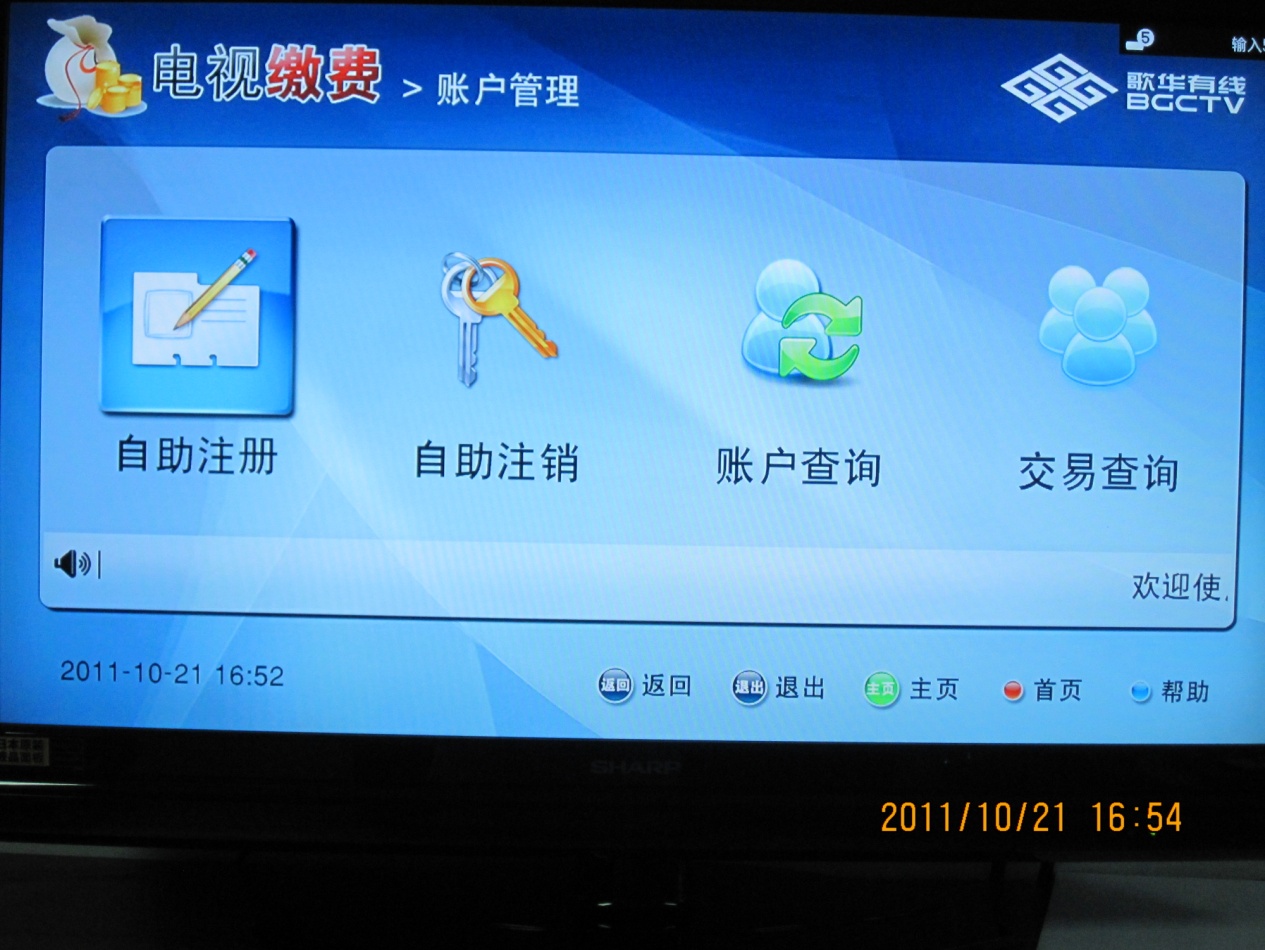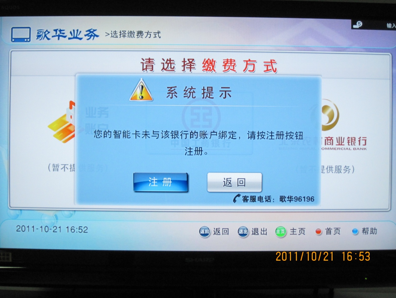 当您首次使用您的银行账户在电视上购买付费点播产品,或进行水、电、煤气等公共事业缴费时,会提示您进行银行账户的注册,通过注册,您可将您的智能卡与您注册的银行账户绑定,智能卡将记录您的注册和绑定信息,以便您通过电视进行相关缴费时进行识别,您可按以下步骤进行银行账户的注册: