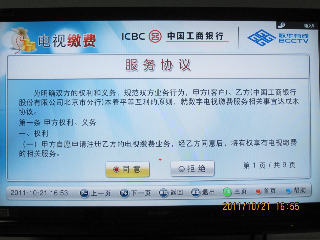 光标停留在“自助注册”按钮,按遥控器【确定】键,进入银行注册服务协议界面: