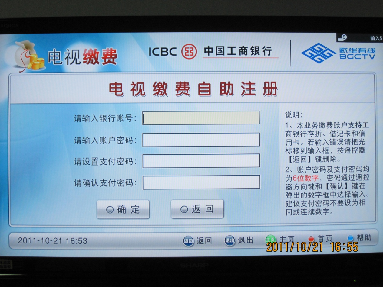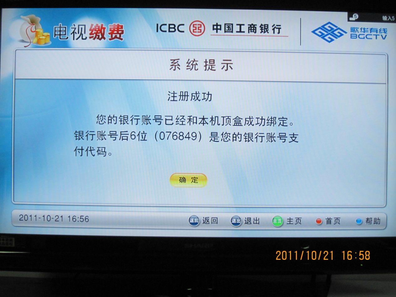 输入您的银行账号和账户密码,并设置支付密码,支付密码是您日后通过银行账户购买产品时验证身份之用,请您牢记,以便您以后购买节目时进行验证,输入完成后,将光标移至“确定” 按钮,按【确定】键进入注册成功提示页,完成账号注册功能。